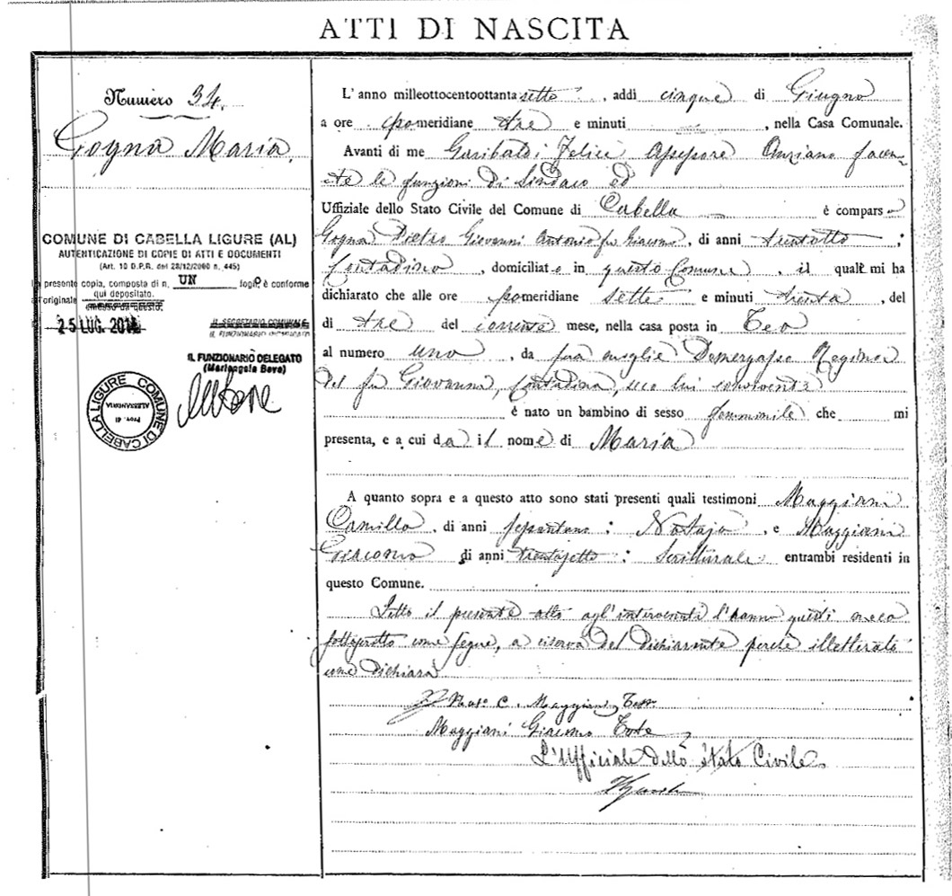 | Nascita | atti-nascita-Gogna-Maria.jpg Formato: image/jpeg Dimensioni dell’immagine: 1.060 × 997 pixel Dimensioni del file: 244 KB Tipo: Foto  |