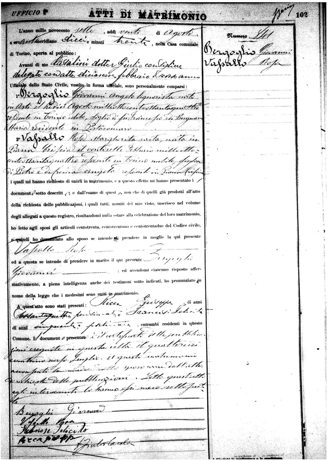 | Matrimonio di un figlio | Mario Giuseppe Francesco Bergoglio — Regina Maria Sivori — View this family 12 dicembre 1935 (Età 51 anni) |