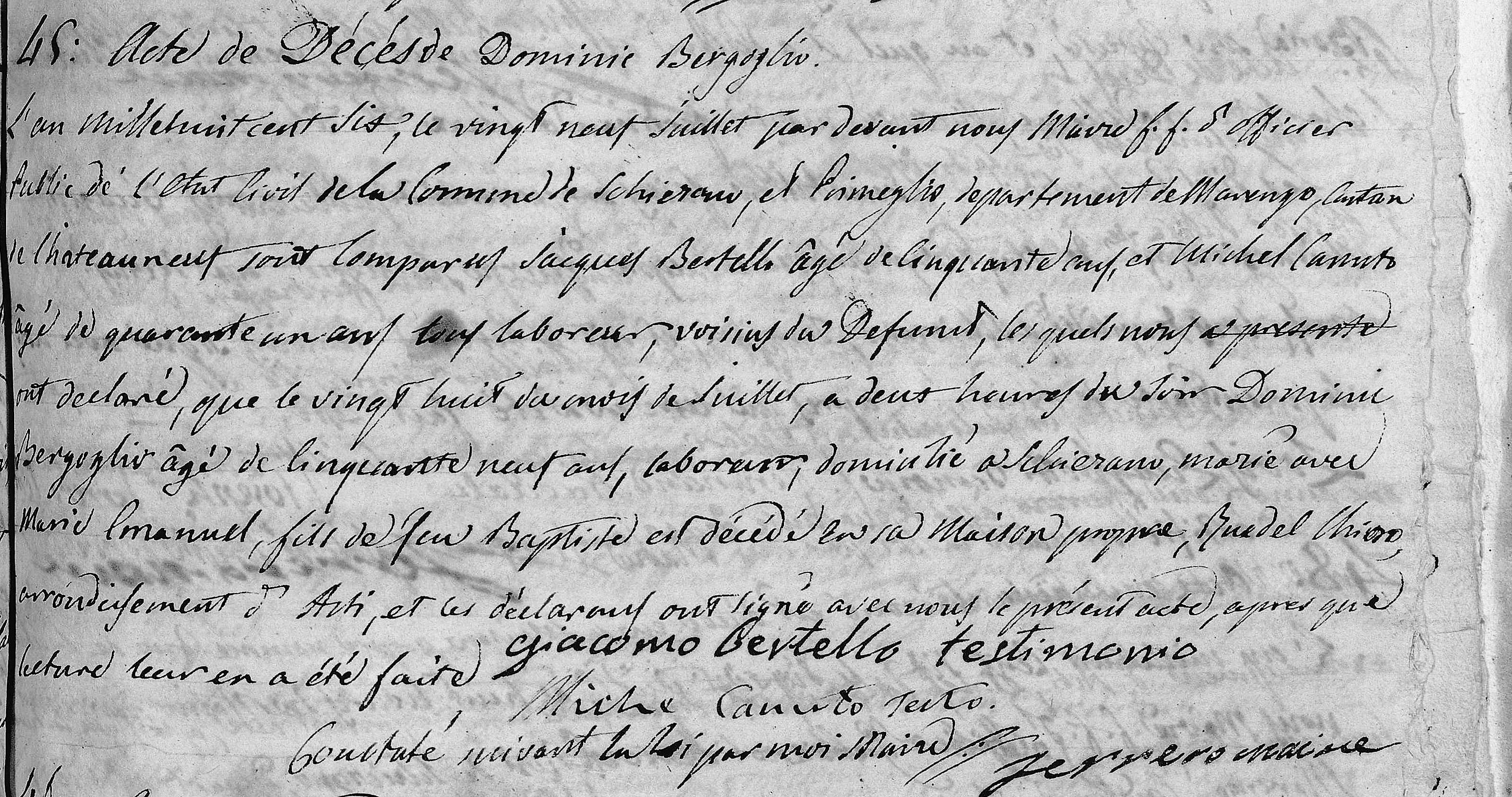 Domenico Bergoglio Nascita: 1747 Morte: 22 luglio 1806 — Primeglio Schierano, Asti, Piemonte, Italy  |
