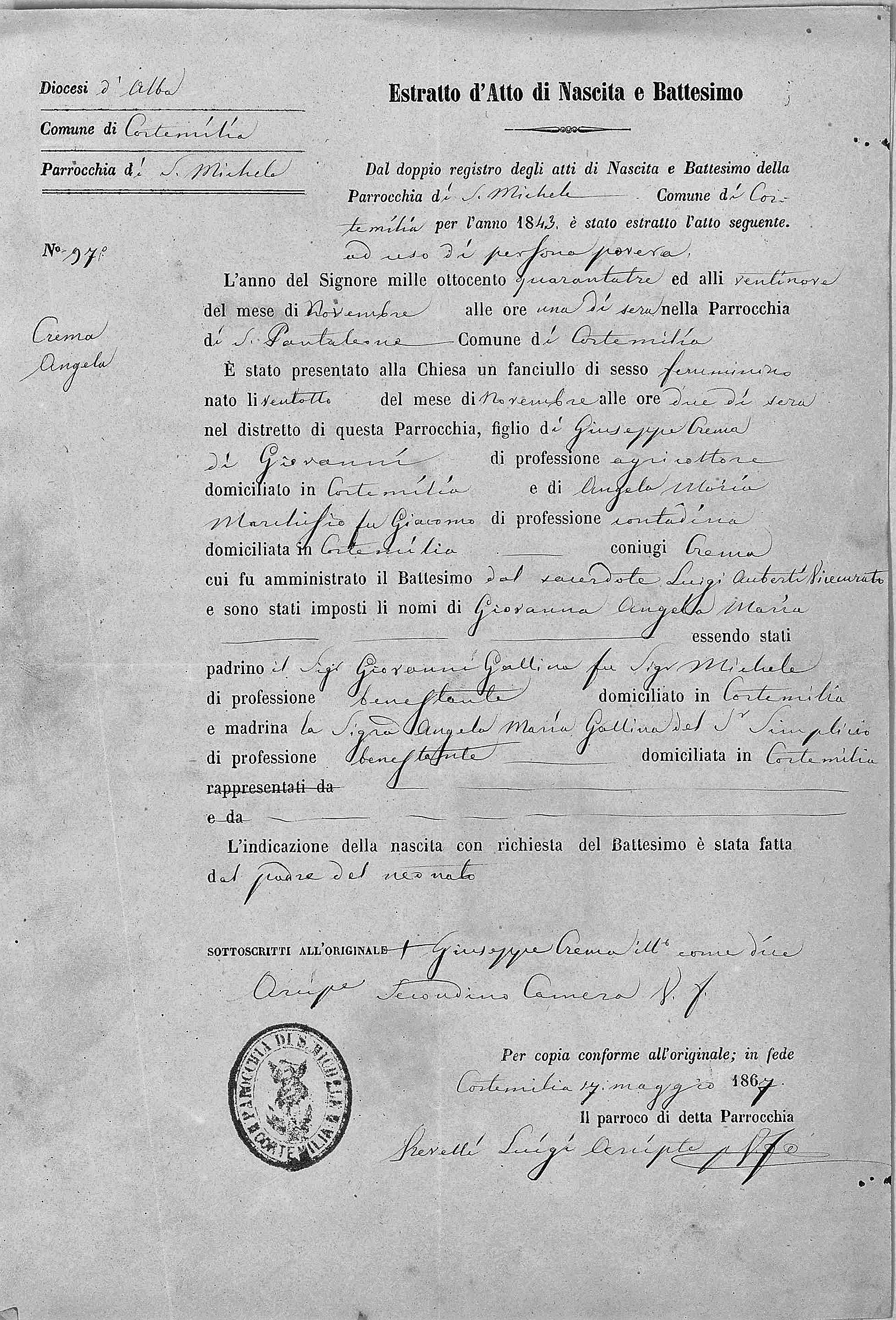 Angela Crema Nascita: 29 novembre 1843 — Cortemiglia, Cuneo, Piedmont, Italy Morte: 24 novembre 1932 — Cagna, Piana Crixia, Savona, Liguria, Italy  |